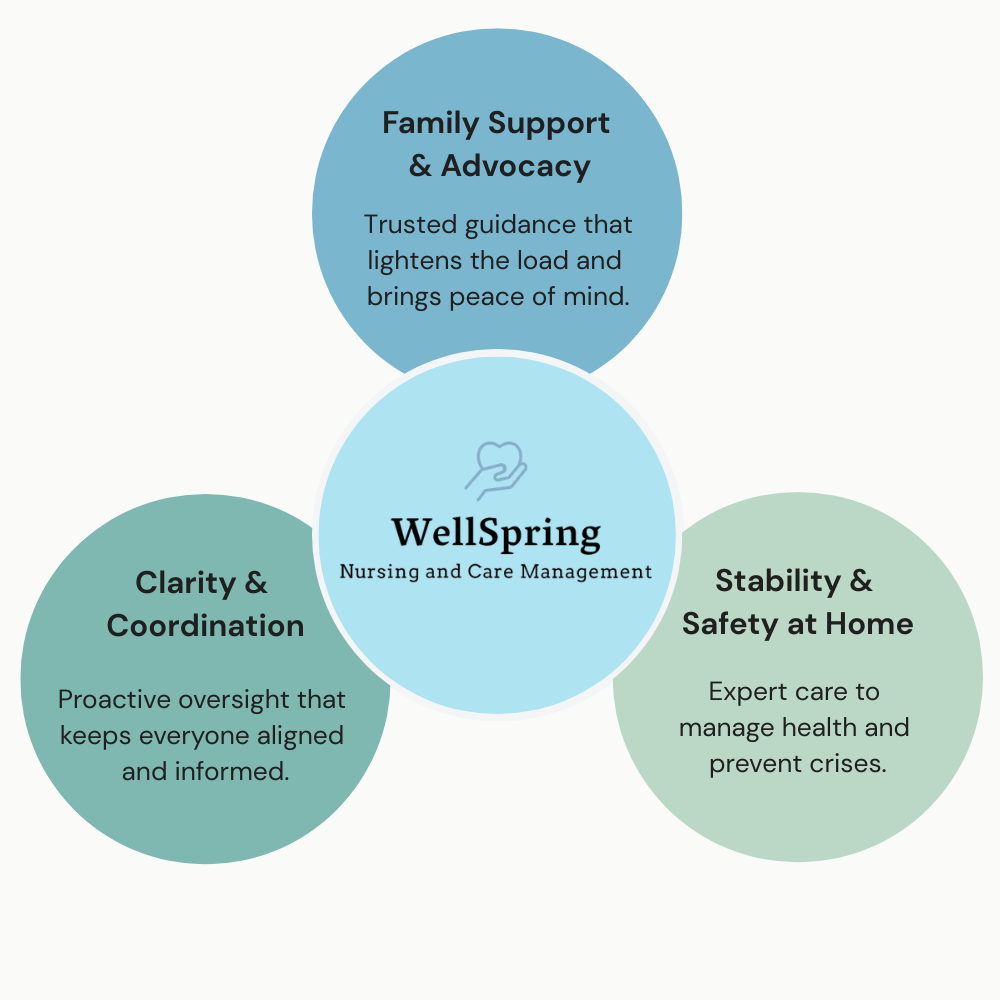 Aging can feel like a maze of appointments, medications, and “what’s next” moments. WellSpring brings it all together — combining advocacy, nursing expertise, and seamless coordination — so families feel confident, supported, and never alone.